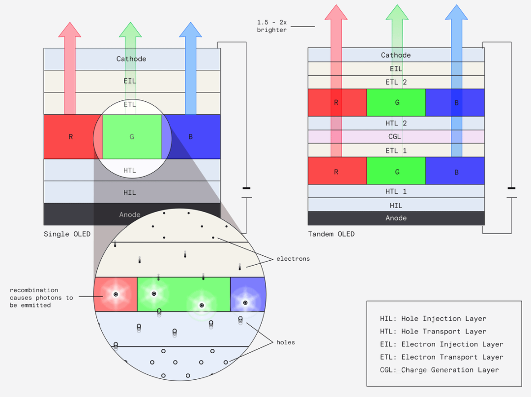 Lisaks koondab mitmekihiline tandemstruktuur laadimiskihi (CGL) kaudu mitu valgust kiirgavat üksust, suurendades heledust ja pikendades seadme eluiga. Need tehnoloogiad on veelgi viinud peavoolu masstootmise lahendusteni, nagu WOLED ja QD-OLED.
