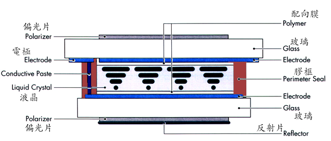 LCD-de põhistruktuur koosneb mitmest täpselt lamineeritud materjalist, sealhulgas polarisaatoritest, elektroodidest, juhtivast pastast, vedelkristallidest, joonduskiledest, klaasalustest, perimeetri tihenditest ja reflektoritest. Iga materjalikiht täidab unikaalseid funktsioone:
